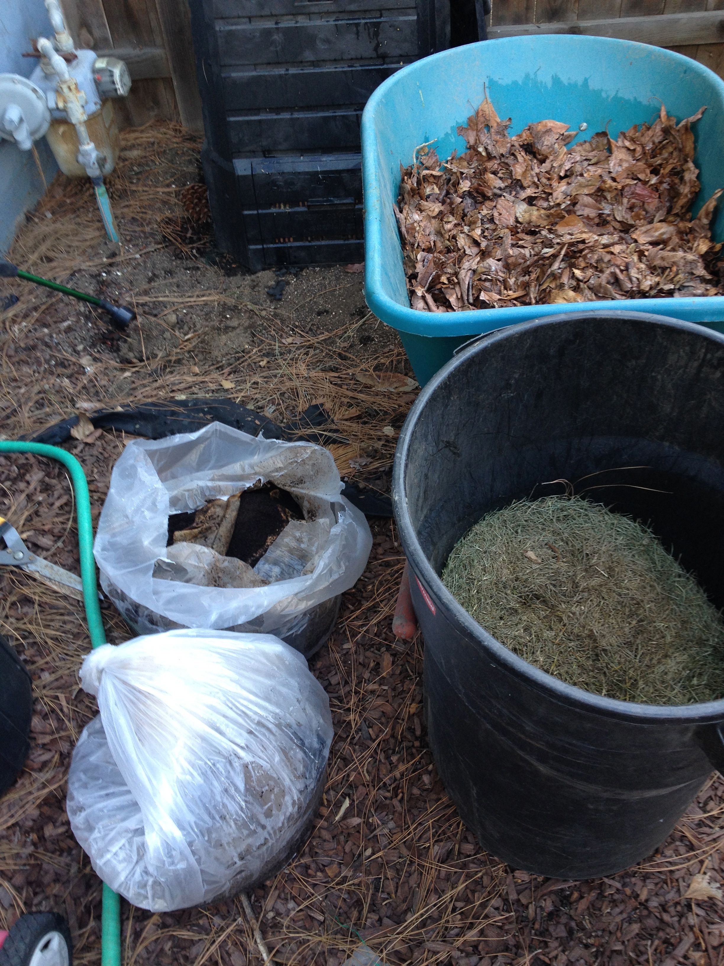 I raided several local Starbucks coffee shops for grounds that they will gratefully give away to gardeners and composters, and began begging, borrowing, and stealing any lawn clippings I could get from the neighbors. Mary and I found a container for the counter where we could begin to collect vegetable food waste and my gardener brought me bags of dried leaves from his clients who had groves of trees.