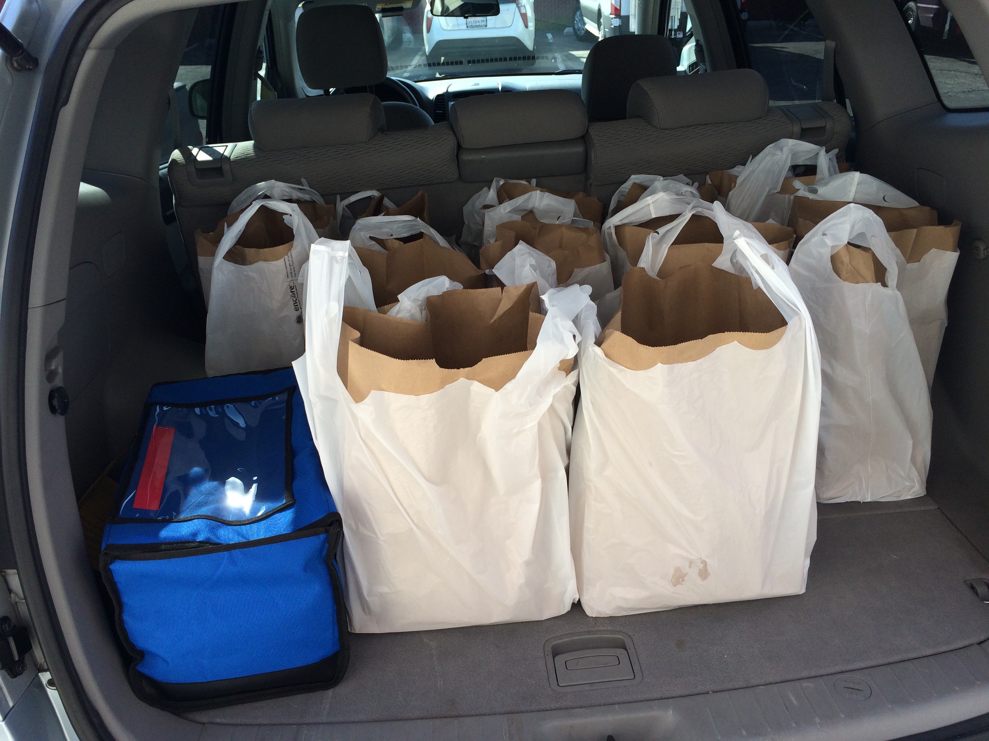 That’s where people like me come in.  I show up every Wednesday at around 3:15, load up my bags of food (my client list has ranged from 7 to 17 on any given day) along with a hot bag that contains a freshly prepared hot meal for each client to have for dinner that night.