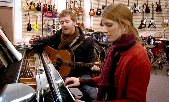 The guy (Glen Hansard) is a street musician and songwriter, and we are immersed in his songs and his dedication to music from the opening scene as he stands out on gritty Dublin streets singing for donations.  He meets the girl (Marketa Iglova) who stops to comment on his songs and toss a coin into his guitar case.  They chat and it turns out that she too is a musician, a pianist.  It only takes the film 14.5 minutes to get the two of them into a music store where she is allowed to play piano during the owner’s lunch break.